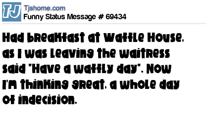 X Had breakfast at Waffle House, as I was leaving the waitress said "Have a waffly day". Now I'm thinking great, a whole day of indecision.