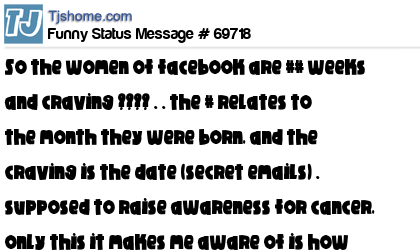 X So the women of facebook are ## weeks and craving ???? . . the # relates to the month they were born, and the craving is the date (secret emails) . supposed to raise awareness for cancer, only this it makes me aware of is how sneaky women are