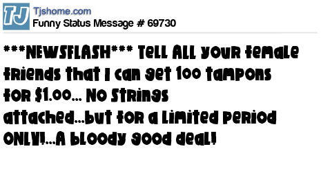 X  ***NEWSFLASH*** Tell ALL your female friends that I can get 100 tampons for $1.00... No Strings attached...but for a limited period ONLY!...A bloody good deal!