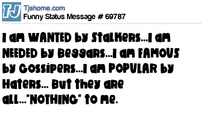 X says I am WANTED by Stalkers...I am NEEDED by Beggars...I am FAMOUS by Gossipers...I am POPULAR by Haters... But they are all..."NOTHING" to me.