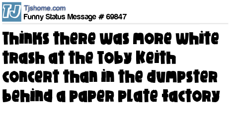 X is Thinks there was more white trash at the Toby Keith concert than in the dumpster behind a paper plate factory
