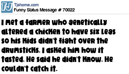 X  I met a farmer who genetically altered a chicken to have six legs so his kids didn't fight over the drumsticks. I asked him how it tasted. He said he didn't know. He couldn't catch it.