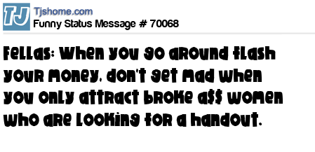 X says Fellas: When you go around flash your money, don't get mad when you only attract broke a$$ women who are looking for a handout.