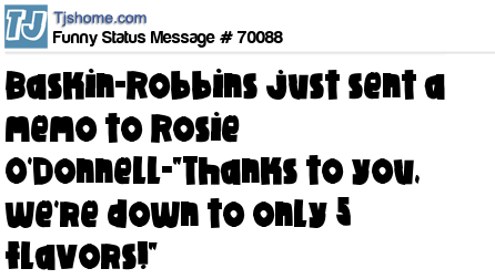 X Baskin-Robbins just sent a memo to Rosie O'Donnell-"Thanks to you, we're down to only 5 flavors!"