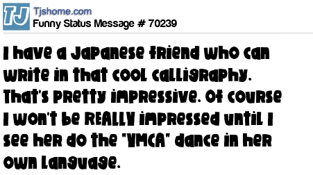 X I have a Japanese friend who can write in that cool calligraphy. That's pretty impressive. Of course I won't be REALLY impressed until I see her do the "YMCA" dance in her own language.
