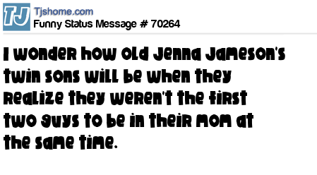 X  I wonder how old Jenna Jameson's twin sons will be when they realize they weren't the first two guys to be in their mom at the same time.