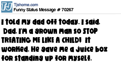 X  I told my dad off today. I said, “Dad, I'm a grown man so STOP TREATING ME LIKE A CHILD!” It worked. He gave me a juice box for standing up for myself.