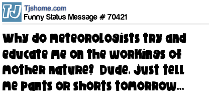 - # 73381 Why does the weather man try and educate me on mother nature? Bro, just tell me pants or shorts tomorrow... hoodie or jacket...