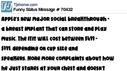 X says Apple's new major social breakthrough - a breast implant that can store and play music. The iTit will cost between $499 - $799, depending on cup size and speakers. Nore more complaints about how he just stares at your chest and doesn't listen!