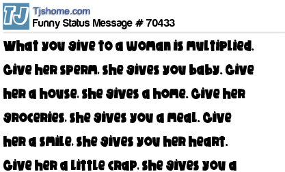 X says What you give to a woman is multiplied. Give her sperm, she gives you baby. Give her a house, she gives a home. Give her groceries, she gives you a meal. Give her a smile, she gives you her heart. Give her a little crap, she gives you a ton of sh!t.