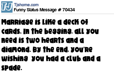- # 104104 Marriage is like a deck of cards. In the beginning all you need is two hearts and a diamond, by the end you will wish you had a club and a spade.