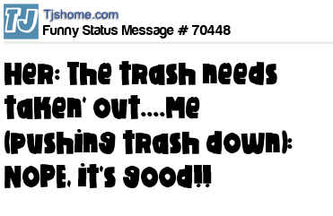 X is Her: The trash needs taken' out....Me (pushing trash down): NOPE, it's good!!