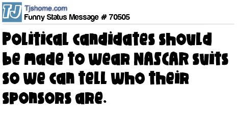 X Political candidates should be made to wear NASCAR suits so we can tell who their sponsors are.
