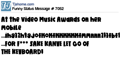 X is at the Video Music Awards on her mobile ...ihg32h9gj0fk0kfkkkkkkfmmnnn273fbf111... ...FOR F*** SAKE KANYE LET GO OF THE KEYBOARD!