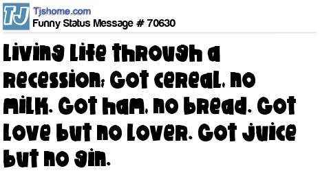 - # 65673 I feel like I'm livin out the movie friday in this damn recession.... Got cereal, no milk.. Got ham, no bread... Got koolaid, no sugar FML