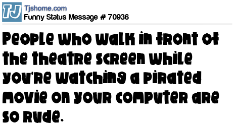 X says People who walk in front of the theatre screen while you're watching a pirated movie on your computer are so rude.