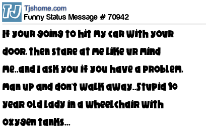 X says If your going to hit my car with your door, then stare at me like ur mind me..and I ask you if you have a problem, man up and don't walk away..Stupid 90 year old lady in a wheelchair with oxygen tanks...