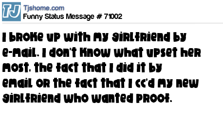 X is I broke up with my girlfriend by e-mail. I don't know what upset her most, the fact that I did it by email or the fact that I cc'd my new girlfriend who wanted proof.