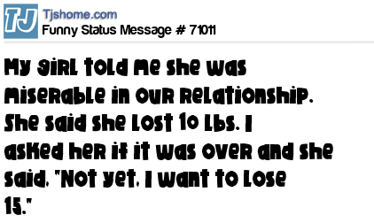X My girl told me she was miserable in our relationship. She said she lost 10 lbs. I asked her if it was over and she said, "Not yet, I want to lose 15."
