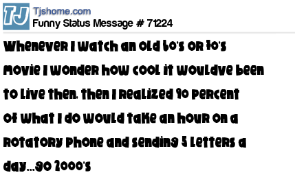 X says whenever I watch an old 60's or 70's movie I wonder how cool it wouldve been to live then, then I realized 90 percent of what I do would take an hour on a rotatory phone and sending 5 letters a day...go 2000's