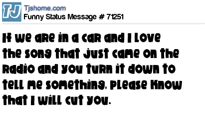 - # 81176 If we're in a car and I love the song on the radio and you turn it down to tell me something, please know that I now hate you