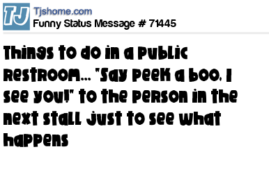 - # 67982 Was in the public rest room - I was barely sitting down when I heard a voice in the other stall: "Hi, how are you?"... Me: embarrassed, "Doin' fine!" Stall: "So what are you up to?"... Me: "Uhhh, I'm like you, just sitting here." Stall: "Can I come over?"