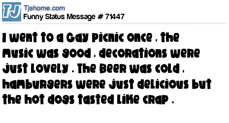 - # 80997 I went to a Gay picnic once , the music was good , decorations were just lovely . The Beer was cold , hamburgers were just delicious but the hot dogs tasted like crap .