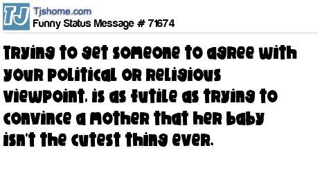 X Trying to get someone to agree with your political or religious viewpoint, is as futile as trying to convince a mother that her baby isn't the cutest thing ever.