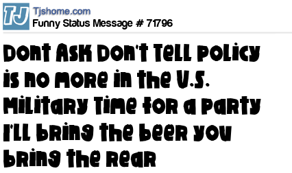 X says Dont Ask Don't Tell policy is no more in the U.S. Military Time for a party I'll bring the beer you bring the rear