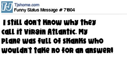 X I still don't know why they call it Virgin Atlantic. My plane was full of skanks who wouldn't take no for an answer!