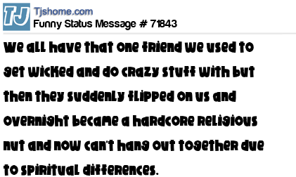 - # 144462 We all have that one friend we used to do all sorts of crazy stuff with but they suddenly flipped the script and became a born again Christian and now feel awkward hanging out with them because we don’t know what to talk about.