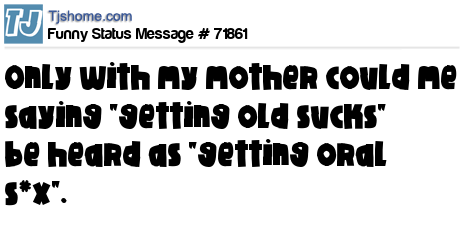 X Only with my mother could me saying "getting old sucks" be heard as "getting oral s*x".