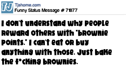 X I don't understand why people reward others with "brownie points." I can't eat or buy anything with those. Just bake the f*cking brownies.