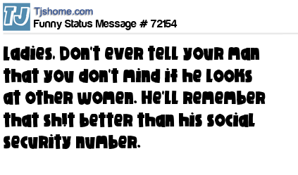 X Ladies, Don't ever tell your man that you don't mind if he looks at other women. He'll remember that sh!t better than his social security number.