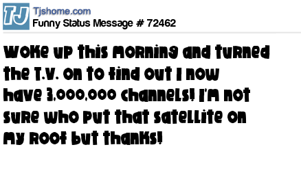 X Woke up this morning and turned the T.V. on to find out I now have 3,000,000 channels! I'm not sure who put that satellite on my roof but thanks!