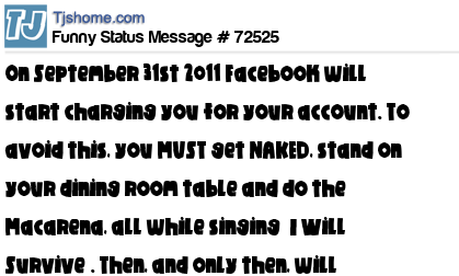 - # 72663 Facebook will start charging you for your account. To avoid this, you MUST get NAKED, stand on your dining room table and do the Macarena, all the while singing ”I Will Survive”. Post it on your Facebook wall.