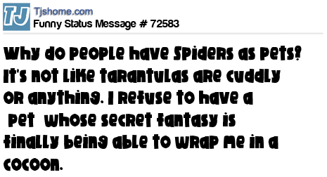 X Why do people have Spiders as pets? It's not like tarantulas are cuddly or anything. I refuse to have a “pet” whose secret fantasy is finally being able to wrap me in a cocoon.