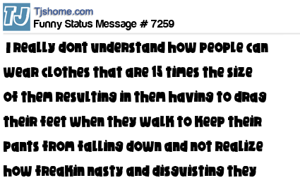 X says I really dont understand how people can wear clothes that are 15 times the size of them resulting in them having to drag their feet when they walk to keep their pants from falling down and not realize how freakin nasty and disguisting they look.