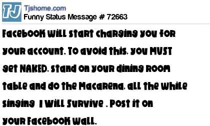 - # 72525 On September 31st 2011 Facebook will start charging you for your account. To avoid this, you MUST get NAKED, stand on your dining room table and do the Macarena, all while singing ”I Will Survive”. Then, and only then, will Mark Zuckerberg come down y