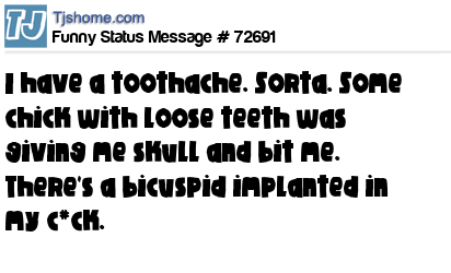 X I have a toothache. Sorta. Some chick with loose teeth was giving me skull and bit me. There's a bicuspid implanted in my c*ck.
