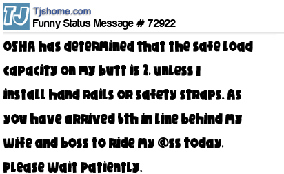 X OSHA has determined that the safe load capacity on my butt is 2, unless I install hand rails or safety straps. As you have arrived 6th in line behind my wife and boss to ride my @ss today, please wait patiently.