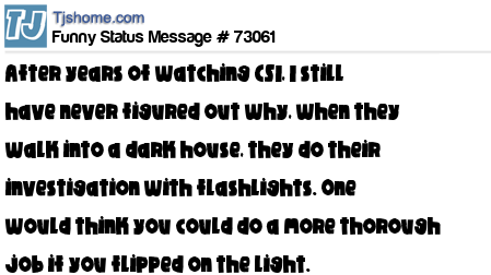 X After years of watching CSI, I still have never figured out why, when they walk into a dark house, they do their investigation with flashlights. One would think you could do a more thorough job if you flipped on the light.