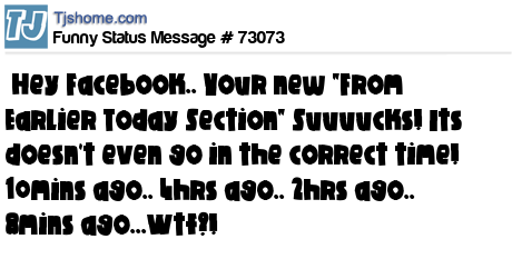 X is Hey Facebook.. Your new "From Earlier Today Section" Suuuucks! Its doesn't even go in the correct time! 10mins ago.. 4hrs ago.. 2hrs ago.. 8mins ago...Wtf?!