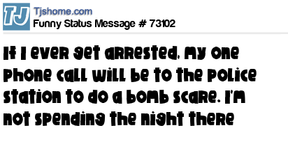 - # 73082 If I ever get arrested.......again..... My one phone call will be to the police station to do a bomb scare. I'm not spending the night there......again.