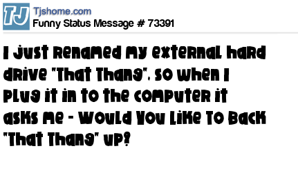 - # 43731 I changed the name of my hard drive to 'that thang,' so once a month, my computer asks me if I wanna back that that thang up.