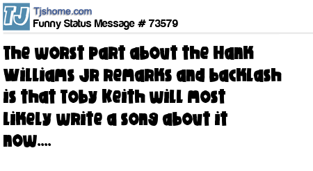 X says The worst part about the Hank Williams Jr remarks and backlash is that Toby Keith will most likely write a song about it now....