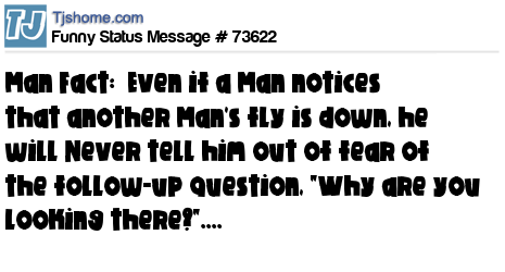 X Man Fact: Even if a Man notices that another Man's fly is down, he will Never tell him out of fear of the follow-up question, "Why are you looking there?"....