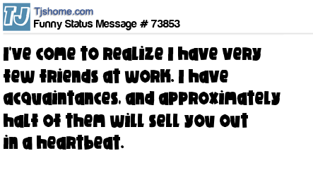 X I've come to realize I have very few friends at work. I have acquaintances, and approximately half of them will sell you out in a heartbeat.