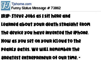 X is iRIP: Steve Jobs as I sit here and learned about your death straight from the device you have invented the iPhone. Now as you set on your iCloud to the pearly gates. We will remember the greatest entrepreneur of our time. - Sent from my iPhone #1955-2011
