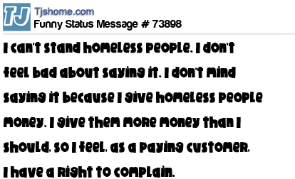 X says I can't stand homeless people. I don't feel bad about saying it. I don't mind saying it because I give homeless people money. I give them more money than I should, so I feel, as a paying customer, I have a right to complain.